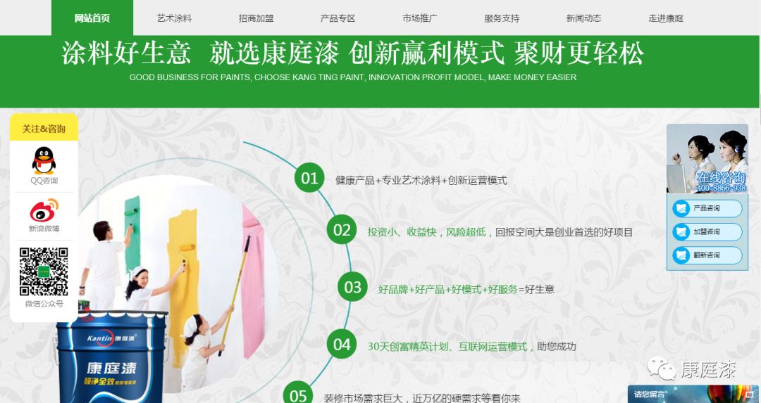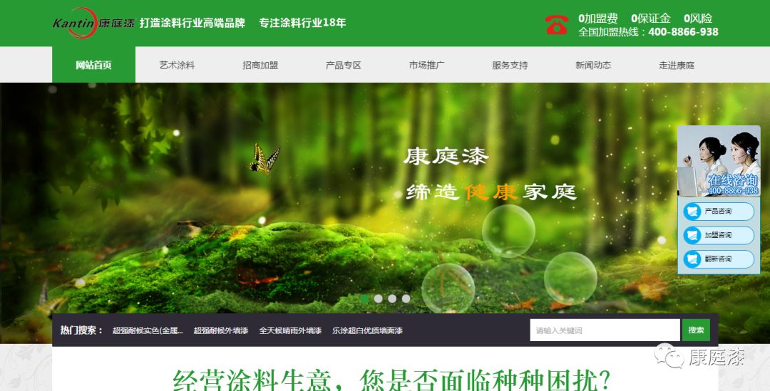 2018年康庭漆新版官网上线,我们更加“注重客户需求,完善健康产品、艺术涂料等使用体验”。康庭漆将以“健康产品+专业艺术涂料+创新运营模式”的营销理念服务于市场和客户。